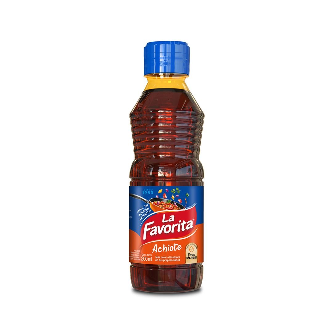 - Mezcla de aceites vegetales de soya y oleína de palma (refinado, blanqueado, desodorizado) con extracto de achiote u onoto (Bixa orellana) de consistencia liquida color rojiza